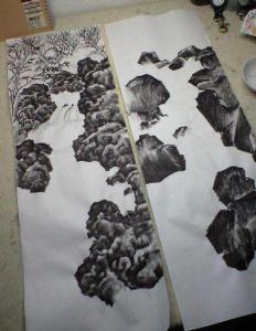 まずは左を意気込んで始めたものの、画面上端の木が暗く、かつ岩が細かくなったので描き直し。